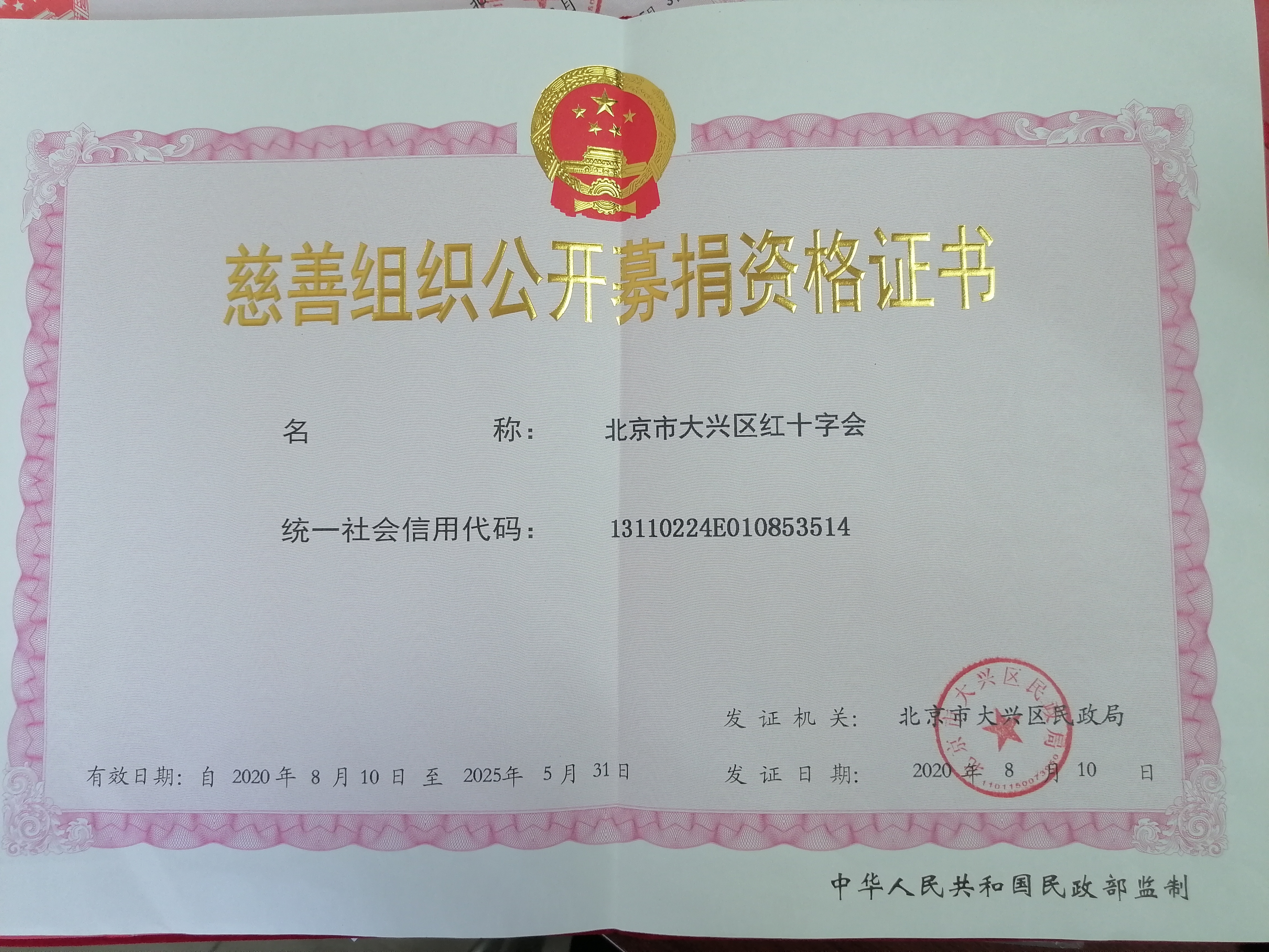 (一)北京市大兴区红十字会统一社会信用代码为13110224E010853514。关于我会公益性捐赠税前扣除资格的公告请点击以下链接:《北京市财政局 国家税务总局 北京市税务局关于公布北京市2021年度-2023年度获得公益性捐赠税前扣除资格的公益性群众团体名单的通知》
