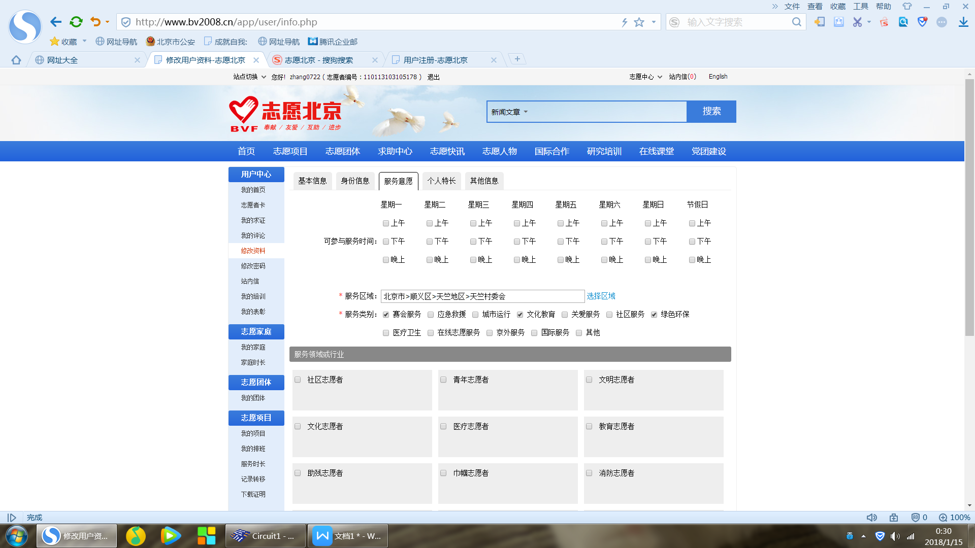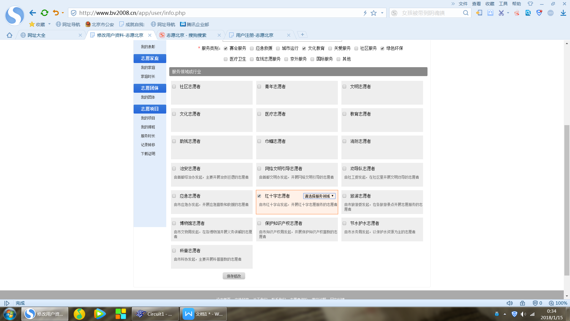 4、如果已经注册成为志愿者,但服务领域行业未勾选“红十字志愿者”可以登录页面后点击“志愿中心”,在用户中心列项中点击“修改资料”,点击修改“服务意愿”,在服务领域行业列项中勾选“红十字志愿者”并选择相关“服务领域”,完成修改后点击“保存修改”。